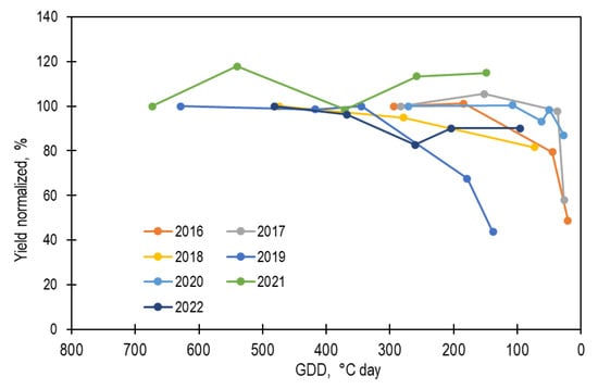 The dependence of the normalized winter wheat yield on the accumulated GDD during the autumn vegetative period from germination to the beginning of dormancy is shown in Figure 9. The amount of yield of the first three sowings, SD1, SD2, and SD3, are practically the same, while the yields of the late sowings, SD4 and SD5, are not completely lost due to late sowing in some years—for example, in 2018, 2021, 2022. Conversely, there are seasons when the yield of the first three sowings is the same, while the yield of the last sowings is significantly reduced. From this, we can conclude that the yield of late sowing does not suffer if the winter is favorable for wintering. Meanwhile, unfavorable winter conditions do not allow late sowing to overwinter properly, so the yield in such cases is significantly lower.