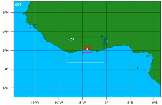 In our study, WRF-Chem version 4.1 [31,32] is used in a three-domain configuration around Abidjan (5.28° N; 4.03° W), as shown in Figure 1. All domains are defined on the Mercator projection. The outermost domain (d01) covers almost all of West Africa and parts of the Atlantic Ocean with a horizontal grid spacing of 25 km × 25 km. The first inner domain, i.e., the 2nd domain (d02), covers Côte d’Ivoire and parts of neighboring countries with a grid spacing of 5 km × 5 km. The innermost domain (d03) covers Abidjan and its surroundings with a grid spacing of 1 km × 1 km. The number of grid points in the (x, y) directions in d01, d02, and d03 are (120, 100), (151, 131), and (181, 161), respectively. All domains have 36 vertical levels extending from the surface to a 50 hPa model top. Approximately 7 model levels are located between the surface and 1 km altitude. We used one-way nesting to run these simulations using the “ndown” capability of WRF-Chem, which means that simulations over the three domains are run in serial mode, with the run of d01 providing initial and boundary conditions for d02, which, in turn, provides initial and boundary conditions for d03. The meteorological time steps for d01, d02, and d03 are 60, 30, and 6 s, respectively, while the chemistry used a time step of 5 min for all domains to reduce the computational cost. The meteorological initial and boundary conditions for d01 are obtained from the ERA interim reanalysis, which are mapped to the WRF domain using the WRF pre-processing system (WPS). Chemical initial and boundary conditions (only for d01) are based on data from the Community Atmospheric Model with Chemistry (CAM-Chem) [38]. A four-dimensional data analysis is applied to d01 above the planetary boundary layer to constrain the growth of meteorological errors in our simulations.