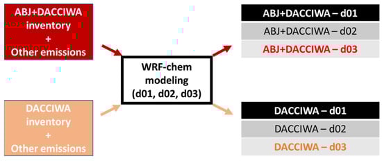 Simulations were conducted using the WRF-Chem model (simplified GOCART model) based on the ABJ+DACCIWA and DACCIWA inventories. These simulations aimed to study the influence of the ABJ+DACCIWA inventory compared to the regional DACCIWA inventory. Over three domains (from regional to urban), simulations were carried out from January to February 2019, a period with extensive observational databases in Abidjan that have been validated.