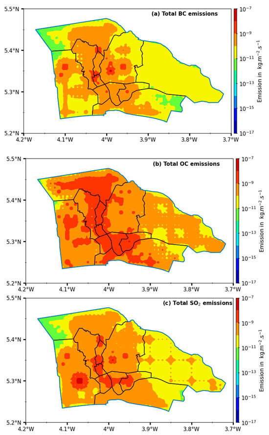Figure 3 shows the spatialized total emissions of BC (a), OC (b), and SO2 (c) obtained for the city of Abidjan.
