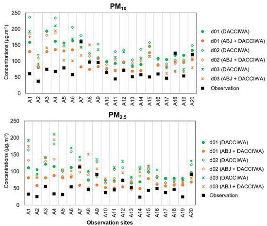 Figure 4 shows the comparison between the WRF-Chem-simulated concentrations against the corresponding PM10 and PM2.5 observations from 20 measurement sites sampled by the Abidjan 2019 intensive campaign and published by Gnamien et al. [11]. The observations are represented with black squares; the simulations based on the DACCIWA inventory are in green; and the simulations based on the ABJ+DACCIWA inventory are in orange. Both the simulations for all the domains overestimate, in general, the PM10 and PM2.5 concentrations at the sites observed by Gnamien et al. [11], except for some sites, A7, A8, A9, A18, and A20, for PM10, and A7, A9, A12, and A20, for PM2.5, where they are underestimated. These sites, which are either close to high-traffic roads or close to industrial areas, are under the influence of road dust, a source not included in the model.
