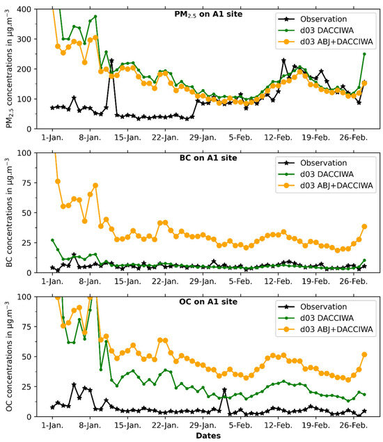 Figure 5 shows the time series of PM2.5, BC, and OC concentrations, simulated on the basis of the DACCIWA (green) and ABJ+DACCIWA (orange) inventories, for d03 (1 km × 1 km) at site A1 from 1 January to 28 February 2019.
