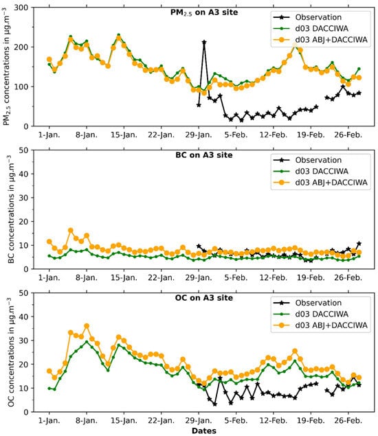 Time series of simulated and observed PM2.5, BC, and OC concentrations at site A3 during January and February of 2019.