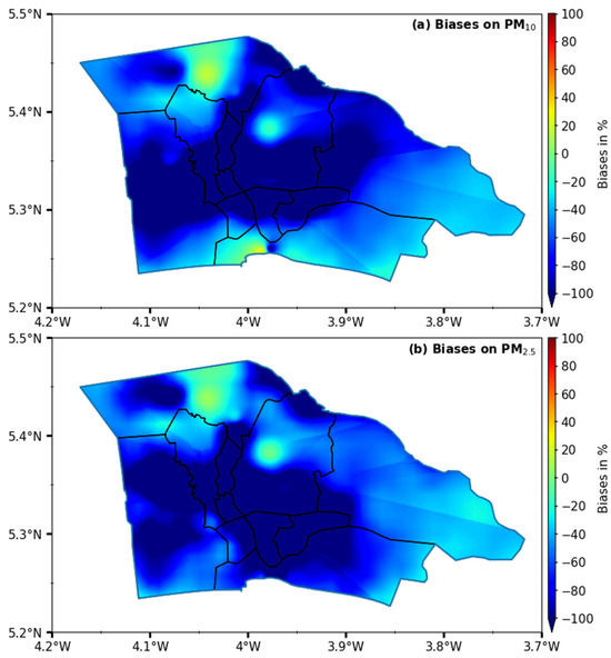 Bias maps of modeled (a) PM10 and (b) PM2.5 concentrations compared with observations from Gnamien et al. (2020) [11].