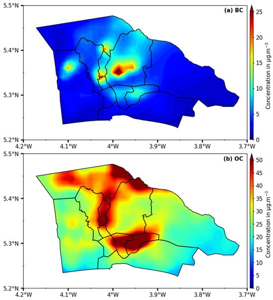 Modeled concentration maps for BC and OC highlight higher BC levels in administrative areas due to road traffic, while OC concentrations are significant in densely populated neighborhoods due to the extensive use of domestic fires and waste burning.