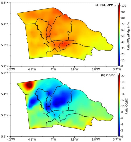 Figure 10 presents the spatial variation maps of PM2.5/PM10 ratios in (a) and OC/BC ratios in (b) obtained from modeling at the d03 domain using the ABJ+DACCIWA inventory. The PM2.5/PM10 ratio represents the relative contribution of PM2.5 (main anthropogenic aerosols) to PM10 concentrations, which, as a reminder, are all aerosols with diameters (d) less than 10 µm. Therefore, this parameter serves as a tracer for anthropogenic sources. The PM2.5/PM10 ratios (Figure 10a) are greater than 50% throughout the city of Abidjan, demonstrating the significance of anthropogenic sources in the city. Furthermore, in densely populated areas, the ratio is up to 90% due to multiple sources of pollution (domestic fires, waste fires, traffic, etc.). These values and the spatial distribution of these PM2.5/PM10 ratios align with the maps created by Gnamien et al. [10] for Abidjan based on observations.