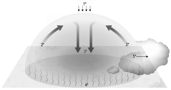 Schematic representation of a heat dome which involves high-pressure areas that trap and heat up the air below. This figure illustrates over a region that high pressure (1 *) in the atmosphere pushes warm air down toward the ground; hot air masses (2 *) expand vertically into the atmosphere as the air sinks (3 *) and it warms by compression; and the ground warms and loses its moisture, which makes it easier to heat even more (4 *). The dome of high pressure inhibits clouds and local rainfall and deflects away storms (5 *). These conditions lead to the onset of a flash drought, and consequences of the persistence of hydro-climatic anomalies over days or weeks can lead to substantial land degradation and desertification [4].