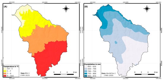 For the examination of temperature patterns, the ERA-5 dataset was employed due to its superior resolution in temperature measurements. In contrast, for the analysis of precipitation, WorldClim data were selected for their unparalleled resolution in precipitation data, ensuring meticulous accuracy and reliability, especially in regions characterized by pronounced variability. Thus, according to ERA-5 reanalysis data for 1999–2023, the average temperature ranged from 3.8 to 10.6 °C. The average precipitation in the specified period (1980–2020) using the WorldClim 2 dataset [74] ranged from 603 to 816 mm (Figure 2).