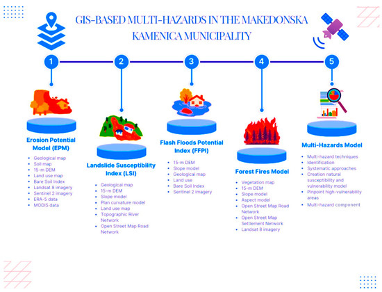 Multi-hazard techniques are vital for hazard event analysis [29,34,46,68,69,70,71,127,128], with probability and deterministic stochastic processes offering an alternative approach. Thus, it is necessary to develop models for assessing potential erosion, landslides, flash floods, and forest fires-prone areas in the MKM, North Macedonia. This study aims to (1) assess multiple hydro-meteorological hazards using a modified erosion assessment model and systematic approaches, (2) create natural susceptibility and vulnerability maps, and (3) pinpoint high- vulnerability erosion areas for implementing prevention measures.