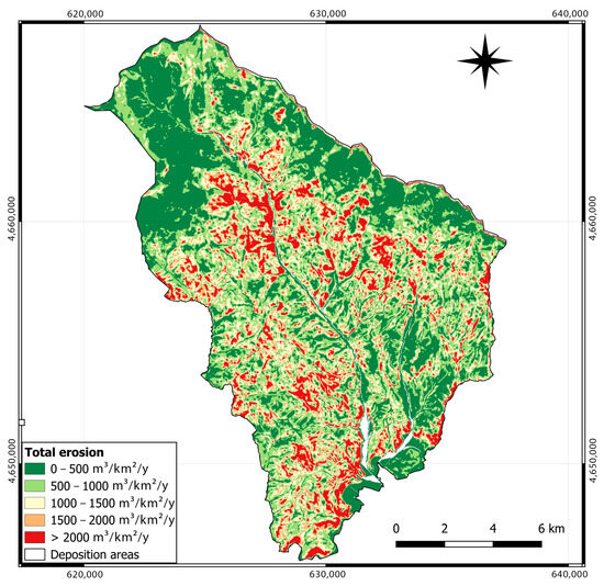 A map was prepared for the MKM (Figure 5) using SAGA GIS (v. 9.3.0) to calculate the total amount of eroded material based on the previously obtained coefficient of erosion Z (erosion vulnerability).