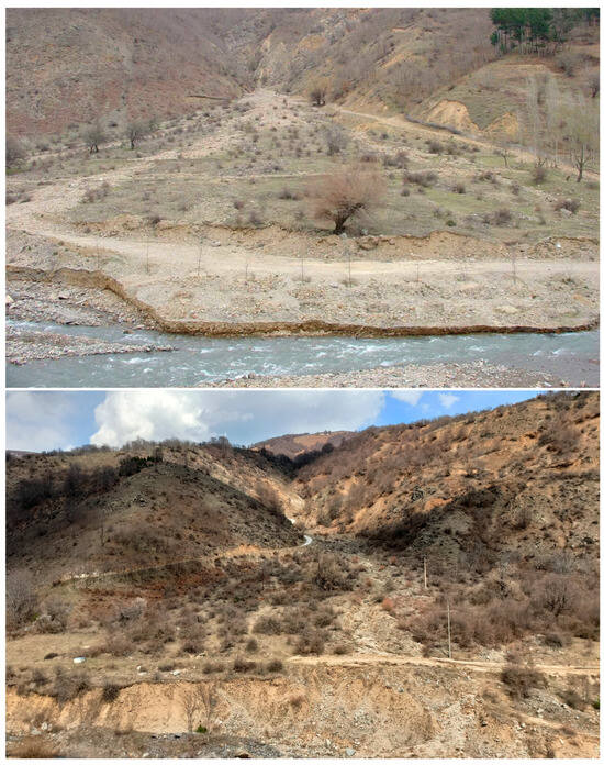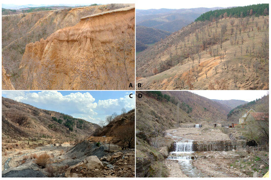 (A) Erosion landforms in the Lukovica River valley; (B) excessive erosion on the steep slopes of the Lukovica River valley; (C) deposition in the Kamenica River valley; (D) excessive deposition in the valley bottom of the Kamenica River.