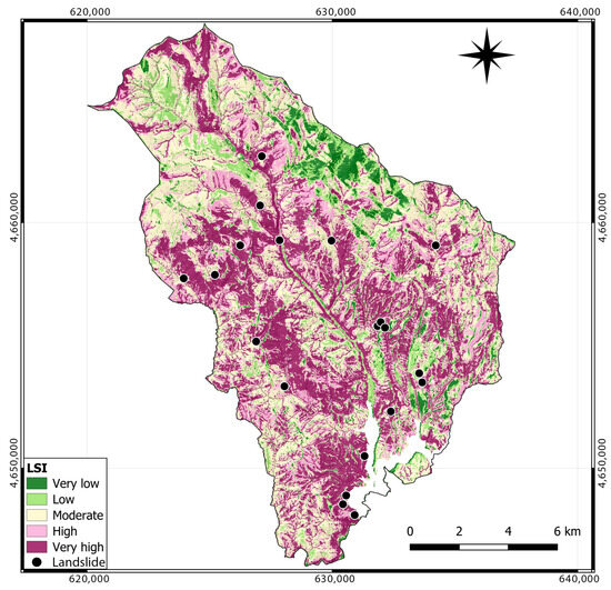 As per [28], a methodology akin to the previous one is adopted for reclassifying LSI values into distinct susceptibility zones and conducting map validation. Each factor is assigned a weighted value, with 30 for slope, 15 for lithology, 10 for land cover, 8 for curvature, and 2 for stream and road distance, totaling 67. These weights signify the relative importance of each factor in triggering landslides within the catchment, with slope being the most influential factor, followed by lithology, land cover, planar curvature, and distance to streams and roads. The cumulative sum of all six parameters determines landslide susceptibility, computed by aggregating values for each grid cell across all layers. The resulting model is classified into five distinct susceptibility classes using natural breaks classification, ranging from very low to very high susceptibility.