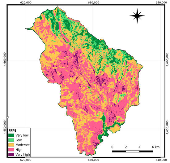 The Flash Flood Potential Index (FFPI) is a widely utilized statistical method for identifying areas vulnerable to flash flooding [34,35,43,45,106,107,108,109]. It integrates various factors such as slope, vegetation cover, land use, and soil type (in this case, represented by lithological type due to data constraints) to provide a quantitative susceptibility assessment. Flash floods often occur in municipality areas with reduced soil infiltration rates, typically due to bare terrain, steep slopes, deforestation, urbanization, or industrialization. The combination of intense precipitation, snowmelt, terrain characteristics, soil properties, and vegetation density (including forests, shrubs, and grasses) influences susceptibility to flash flooding (e.g., [110,111,112,113,114,115]). Less vegetated areas generally have a higher vulnerability.