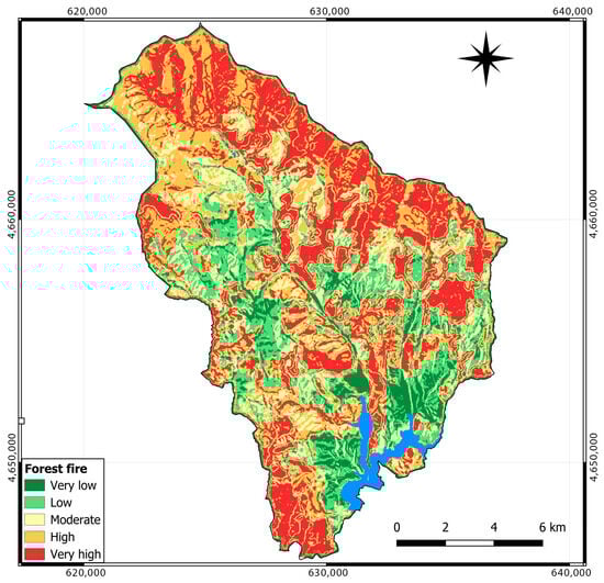 In this equation, RC is the numerical index of forest fire vulnerability zones where VT indicates vegetation type with 5 classes, S the slope factor with 5 classes, A the aspect variable with 4 classes, and DR and DS indicates distance factor from road and settlement [47]. Terrain slope and aspect were determined using a 15 m resolution digital elevation model (DEM). Slope values, expressed in degrees, were categorized, with steeper terrains receiving higher values due to reduced accessibility. The vegetation type index was derived from the CLC2018 geospatial database [75], assigning values from 1 to 5 based on the predominant vegetation in each area. Water surfaces and large settlements were deemed the least susceptible, as fire vulnerability in such areas is minimal [45]. To calculate the distance index from roads, settlements, and buildings, satellite images and topographic maps were digitized, creating buffer zones of suitable width. Finally, based on this analysis carried out, a fire vulnerability zone map was produced.