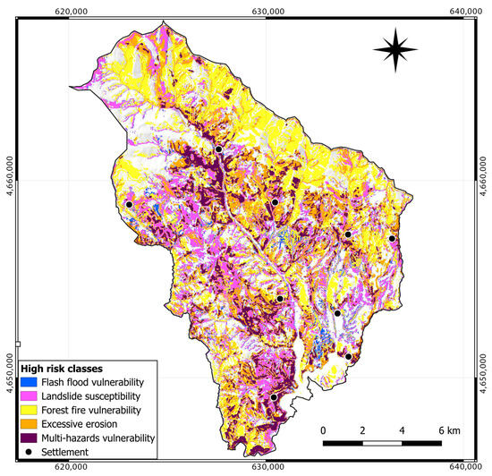This study presents a comprehensive analysis of natural hazard susceptibility in the Makedonska Kamenica municipality of North Macedonia, encompassing erosion assessment, landslides, flash floods, and forest fire vulnerability. Employing advanced GIS and remote sensing (RS) methodologies, hazard models were meticulously developed and integrated to discern areas facing concurrent vulnerabilities. Findings unveil substantial vulnerabilities prevalent across the area, notably along steep terrain gradients, river valleys, and deforested landscapes. Erosion assessment reveals elevated rates, with a mean erosion coefficient (Z) of 0.61 and an annual erosion production of 182,712.9 m3, equivalent to a specific erosion rate of 961.6 m3/km2/year. Landslide susceptibility analysis identifies 31.8% of the municipality exhibiting a very high probability of landslides, while flash flood susceptibility models depict 3.3% of the area prone to very high flash flood potential. Forest fire susceptibility mapping emphasizes slightly less than one-third of the municipality’s forested area is highly or very highly susceptible to fires. Integration of these hazard models elucidates multi-hazard zones, revealing that 11.0% of the municipality’s territory faces concurrent vulnerabilities from excessive erosion, landslides, flash floods, and forest fires. These zones are predominantly located in upstream areas, valleys of river tributaries, and the estuary region. The identification of multi-hazard zones underscores the critical need for targeted preventive measures and robust land management strategies to mitigate potential disasters and safeguard both human infrastructure and natural ecosystems. Recommendations include the implementation of enhanced monitoring systems, validation methodologies, and community engagement initiatives to bolster hazard preparedness and response capabilities effectively.
