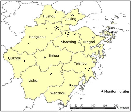 The data for each pollutant, including PM2.5, PM10, NO2, CO, and O3, were obtained from the hourly concentration data released by the National Urban Air Quality Real-time Distribution Platform of the China Environmental Monitoring General Station (CEMG) at https://air.cnemc.cn:18007 (accessed on 23 June 2024). Fourteen monitoring stations in Hangzhou were selected. These are shown in Table 1: Binjiang, Xixi, Qiandao Lake (control point), Xiasha, Wolongqiao, Zhejiang Agricultural University, Zhaohui (five districts), Harmony Primary School, Linping Town, Chengxiang Town, Yunqi, Fuyang No. 2 High School, Municipal Office Building, and Fire Brigade. To assess the effectiveness of the safeguard measures, data on the concentration of pollutants at these 14 stations were also collected for the same period in 2022. Based on this, pollutant data were collected from several neighboring cities, including Ningbo, Wenzhou, Shaoxing, Huzhou, Jiaxing, Taizhou, Zhoushan, Jinhua, Quzhou, and Lishui; the monitoring stations in each city are shown in Figure 1.