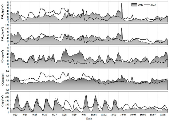 To study the impact of Hangzhou Asian Games safeguard measures on the air quality of Hangzhou, the hourly concentration changes in various pollutants from 23 September to 8 October 2023 were compared with those of 2022, as shown in Figure 2. Referring to the national ambient air quality standard, the 24 h Grade I standard average concentration limits for PM2.5, PM10, NO2, and CO are as follows: 35 µg/m3, 50 µg/m3, 80 µg/m3, and 4 mg/m3, respectively. The 24 h Grade II standard average concentration limits for these pollutants are 75 µg/m3, 150 µg/m3, 80 µg/m3, and 4 mg/m3, respectively. Figure 2 indicates that during the 16 days of the 2023 Hangzhou Asian Games, the average concentration of PM2.5 met the national ambient air quality Grade I standard on 14 days, whereas during the same period in 2022, it met the Grade I standard on all days.