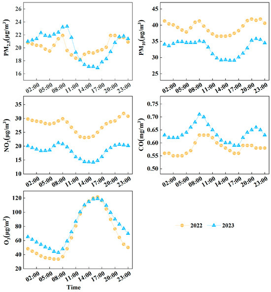To gain a deeper understanding of the impact of the implementation of safeguards on air pollutant concentrations, the mean values of the concentrations of PM2.5, PM10, NO2, CO, and O3 were analyzed at different moments, as shown in Figure 3. The analysis results indicate that daily trends of these air pollutants exhibit similar patterns, with O3 showing a more pronounced daily variation compared to the other pollutants.