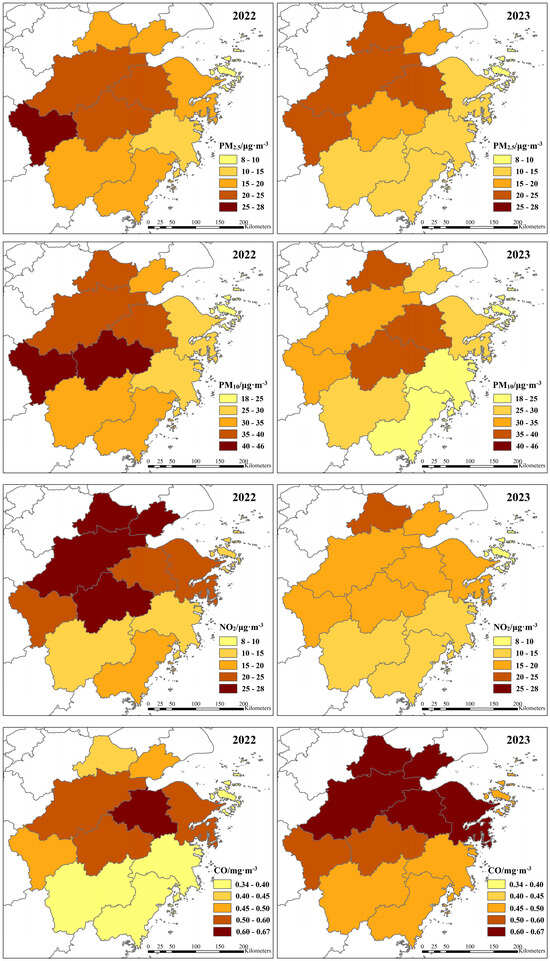 The spatial distribution of concentrations of five pollutants in Hangzhou and surrounding areas during the Asian Games period (right) compared with the same period in 2022 (left).
