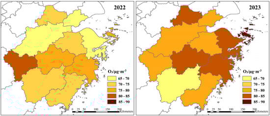 Figure 4 shows the spatial distribution of the concentrations of five pollutants in Hangzhou and its surrounding areas during the Asian Games compared with the same period in 2022. It can be seen from Figure 4 that the spatial distribution of pollutant concentrations varies significantly between the east, west, south, and north. The eastern region of Zhejiang Province generally has lower pollutant concentrations, possibly due to its proximity to the ocean and favorable sea–land breeze convection conditions, which facilitate the dispersion and dilution of pollutants. The western region, characterized by mountains and relatively closed terrain, has higher pollutant concentrations as compared to the eastern coastal areas, where atmospheric circulation is not as favorable. Southern areas such as Lishui and Wenzhou generally have better air quality. In the northern part of Zhejiang Province, air pollution is relatively serious, and its air quality shows a trend of deterioration from south to north. Real-time monitoring data showed that foggy weather had occurred in northern and some parts of central Zhejiang, and the air quality was poor in some areas. This difference may be because northern Zhejiang is more populated and the cities of Hangzhou and Jiaxing are more industrially developed, and the fact that industrial discharge exceeds the carrying capacity of the environment is a significant factor in environmental pollution. From Figure 4, it is clear that although there are still noticeable differences between the northern and southern regions, the overall air quality in Zhejiang Province shows an improving trend in 2023.