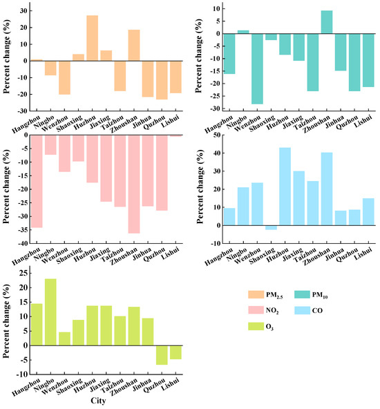 Figure 5 shows the changes in the concentrations of five pollutants in Hangzhou and its neighboring cities during the Asian Games and the same period in 2022. It can be seen that in the 11 cities of Zhejiang Province, the concentrations of the three pollutants, i.e., PM2.5, PM10, and NO2, showed an overall declining trend in 2023. This may be attributed to a series of air quality improvement measures implemented by the local government during the Asian Games around Hangzhou and its surrounding areas, such as restricting industrial emissions and promoting new energy vehicles. The implementation of these measures helped to reduce suspended particles and harmful gases in the atmosphere, thereby improving air quality. Specifically, 11 cities in Zhejiang Province saw reductions in PM2.5 concentrations ranging from −27.1% to 23.0%, PM10 concentrations ranging from −9.2% to 28.2%, and NO2 concentrations ranging from 0.6% to 36.2%. However, during this period, the concentrations of CO and O3 increased to varying degrees. The variation in CO concentration ranged from −42.9% to 2.3%, while the variation in O3 concentration ranged from −23% to 6.6%. These increases may be due to complex environmental factors and chemical reactions.