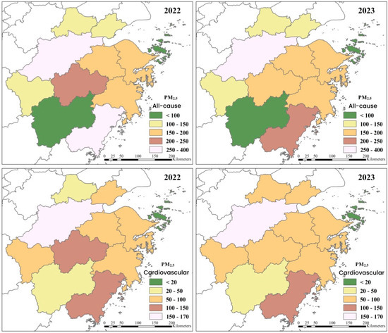 Human exposure to air pollution, especially in heavily polluted areas, is likely to induce respiratory, cardiovascular, reproductive, and immune system diseases and may even lead to death [40,41]. Table 2 summarizes the health effects of PM2.5 and O3 in Hangzhou and its surrounding areas during the Asian Games period and the same period in 2022. Our study primarily focused on the health risk assessment of PM2.5 and O3 and did not involve other pollutants for several reasons. Firstly, research indicates that in recent years, air pollution in China is predominantly characterized by composite pollution led by PM2.5 and O3 [42]. Numerous studies have confirmed that PM2.5 and O3 are closely associated with all-cause and cardiovascular disease mortality, making them key indicators for evaluating the health impacts of air pollution. Secondly, during the study period from 23 September 2023 to 8 October 2023, although other pollutants such as PM10, NO2, and CO were also monitored, their concentrations were generally low and did not reach levels that significantly impact public health. Additionally, there are well-established research methods and models for assessing the health effects of PM2.5 and O3, enabling us to conduct more effective analyses and obtain reliable results.
