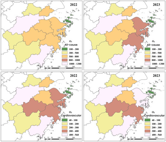 The health impacts of O3 during the Asian Games period in Hangzhou and its surrounding areas compared with the same period in 2022.