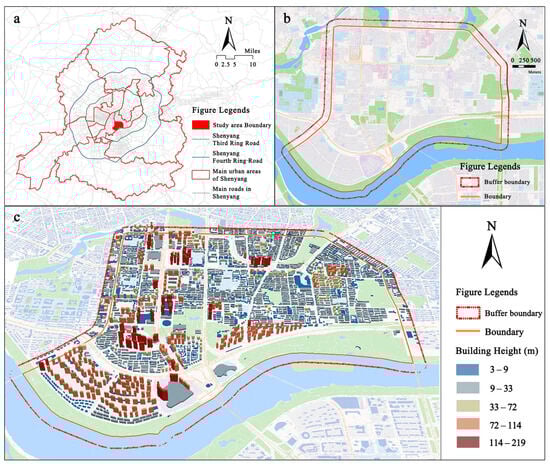 Schematic summary of the study area: (a) Location map of Shenyang City. (b) Wenhua Road block map. (c) Block three-dimensional architectural forms diagram.