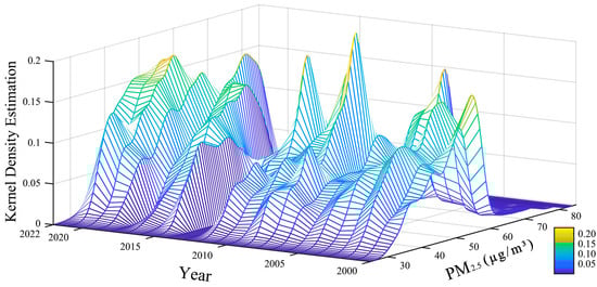 The study area is located in Shenyang, capital city of Liaoning Province in China (41°11′51″ N–43°02′13″ N, 122°25′09″ E–123°48′24″ E) (Figure 1a), which has a temperate continental climate with an average annual temperature of 8.4 °C and annual precipitation of 510-680 mm. Shenyang serves as an important heavy industrial base with abundant natural resources and a solid industrial foundation [24]. As the largest central city in Northeast China and one of the most significant industrial bases in the country, the air pollution of Shenyang is mainly caused by vehicle exhaust, fossil fuel combustion, industrial production, and urban construction [25]. As the urbanization progresses quickly and the environmental pollution becomes increasingly serious, air pollution—particulate matter pollution, in particular—urgently needs to be addressed [26]. According to the data, through the kernel density estimation, the PM2.5 in the Shenyang City area from 2000 to 2013 showed an increasing trend, with the annual average concentration up from 58.50 μg/m3 to 72.49 μg/m3; even though the PM2.5 had been curbed to a certain extent in the area from 2013 to 2022 because of the implementation of policies such as the Air Pollution Prevention and Control Action Plan, the annual average concentration remained high, making the situation unfavorable (Figure 2).