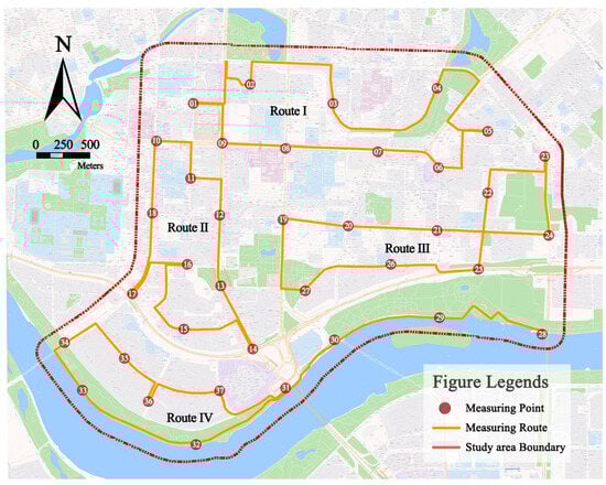 - Make the mobile monitoring route: The mobile monitoring is carried out at time intervals. These routes are connected in a series with all the monitoring points. Considering the monitoring length and staffing, four monitoring routes are designed (Figure 3) to ensure that the monitoring data of the particulate matter concentration in different LCZ can be obtained in the same time period.