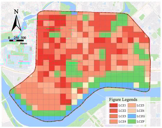From the LCZ classification of the Wenhua Road block (Figure 4), it can be seen that the road block as a whole has a rich variety of architectural forms, including LCZ1–LCZ3 with a compact layout and LCZ4–LCZ6 with an open type, and there are also LCZP green areas and LCZG water areas with a natural environment type. The distribution of specific types of LCZs is characterized as follows: In terms of the built environment type, road block LCZ1 is mainly distributed on both sides of Qingnian Street and the commercial area on both sides of Wenhua Road; LCZ2 is mainly distributed on both sides of Wenhua Road, typically represented by dense mid-rise residential buildings; LCZ3 is mainly distributed on the north side of the Hunhe River, which consists of low-rise compact villas; LCZ4 is mainly distributed on both sides of Qingnian Street, which is a high-rise open residential area; LCZ5 is mainly distributed in the residential area on the north side of Nanta Street, which is an open mid-rise residential area; and LCZ6 is a relatively small distribution of open low-rise areas. As for the natural environment type, LCZG waters are represented by the Hunhe River, which appear as a zonal distribution on the south side of the study area; LCZP green spaces include Wulihe Park, Popular Science Park, and Nanta Park on the north side of the Hunhe River.