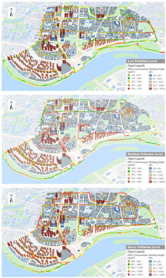 At pollution level 2 (Figure 7b), the concentration of PM1 was in the range of 25–42 μg/m³, the concentration of PM2.5 was in the range of 53–70 μg/m³, and the concentration of PM10 was in the range of 54–87 μg/m³. The high pollution indices of the three pollutants are located in the central areas of the block, including the Shenyang Conservatory of Music, Shimao Wulihe River Road block, Popular Science Park, and Nanta Road block. The central areas of the block as a whole show a high pollution phenomenon, mainly due to the influence of the Wulihe River Park of Hunhe River in the south and Qingnian Park and South Canal in the north, coupled with the dense construction in the central areas of the block, which makes it difficult for pollutants from the north and the south to be transported outward. The area with a low pollution index is distributed in the southern part of the study area, Wulihe River Park, the business district of the Mixc north of the study area, and the South Canal block; these two blocks are affected by the adsorption of pollutants from the park’s greenery, and coupled with high spatial openness, the pollutants diffuse relatively quickly; thus, the pollution here is relatively low.
