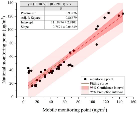 At the same time, we verified the accuracy of the measured data. By summarizing the hourly average data disclosed by the national monitoring stations, our research also counted the hourly average of the four monitoring routes under the seven-day measurement period. After fitting, it was found that the accuracy was 0.866 (Figure 6), and the fitting effect was good. The field measurement data studied were consistent with the trend of the national public data, and the measurement data had strong confidence. It could represent the concentration level of particulate matter in the study area.