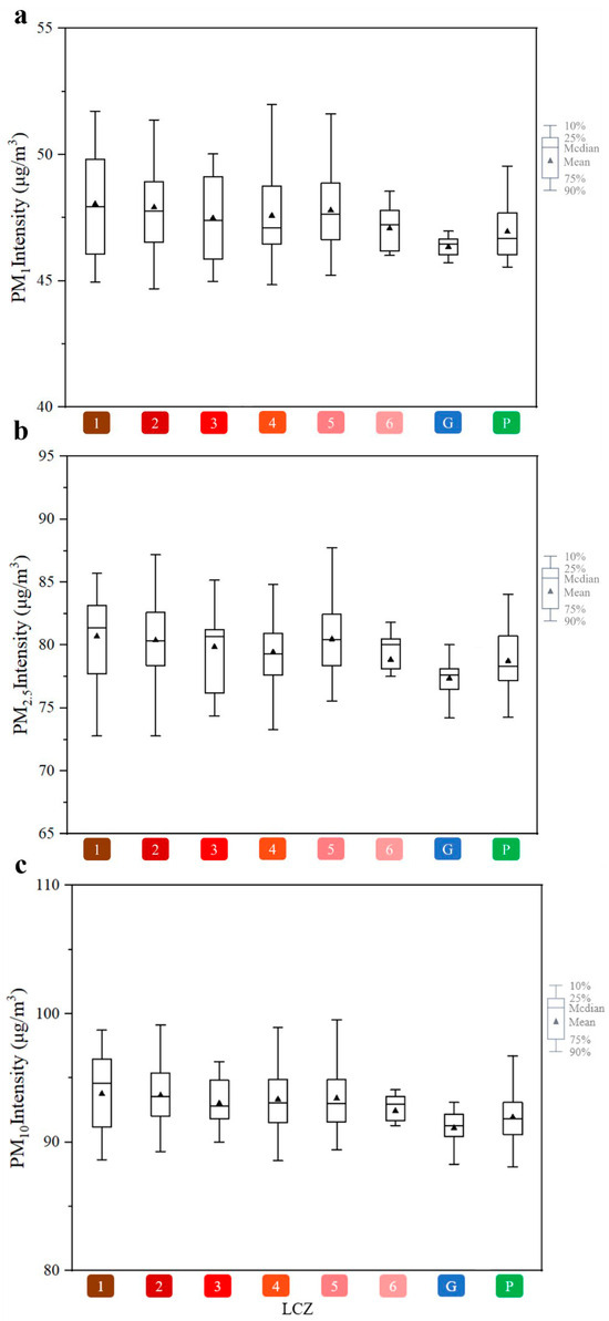 Statistical map particulate matter concentration under different LCZ land use classifications: (a) Statistical maps of PM1 concentrations under different LCZ land use classifications; (b) Statistical Map of PM2.5 Concentration under Different LCZ Land Use Classification; (c) Statistical maps of PM10 concentrations under different LCZ land use classifications.