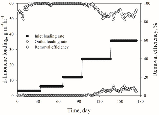 Another possible reason for the decrease in the removal efficiency with an increase in d-limonene loading is that d-limonene has a low water solubility (7.57 mg L−1, 25 °C) [7], which limited the mass transfer between the gas and biofilm. This, in consequence, would inhibit the performance of the biotrickling filter [36]. It should be noted that the effectiveness of the biotrickling filter may be correlated with their physical and chemical properties of VOCs [41].