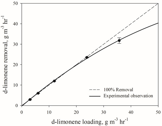 D-limonene removal capacity of d-limonene with respect to its loading rate.