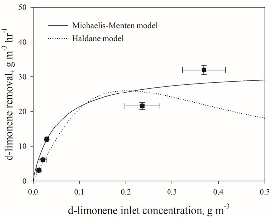 Figure 4 shows the elimination capacity of the loading of the biotrickling filter using the logarithmic mean of the substrate concentration and microbial activity in the biotrickling filter, as demonstrated in the Michaelis–Menten and Haldane models. The Michaelis–Menten and the Haldane models (denoted as ECmax and EC* for each model) provided maximum removal efficiencies of 32.0 g m−3 h−1 and 26.0 g m−3 h−1, respectively, whereas the experimentally observed value was 31.8 g m−3 h−1. It can be deduced from Figure 4 that there was no substrate inhibition during the biotrickling filter run. The reduced performance may be due to limitations in mass transfer. As limonene is highly hydrophobic, some research is investigating the addition of surfactants or the use of fungi to improve the removal of hydrophobic compounds. Other possible causes of reduced performance could be the saturation of microbial capacity or changes in the microbial community. This is beyond the scope of this study, but is worth considering for future studies. Therefore, further investigation is necessary to determine the reason for the observed decrease in the removal efficiency with an increase in d-limonene loading.