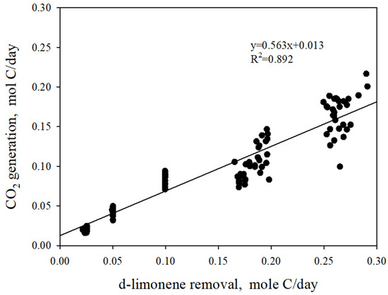 Figure 5 shows the CO2 production rate as a function of consumed d-limonene. The regression line in Figure 5 represents a term of (1 − Y) in Equation (14), while the y-intercept represents the endogenous respiration rate. The observed biomass yield coefficients (mole biomass/mole carbon as the substrate) were 0.437, which corresponds to 0.363 g biomass/g substrate (dry weight basis) if a molecular formula for biomass C5H7O2N is considered. The endogenous respiration rate was low (0.013), indicating that endogenous microbial activity was less significant during the operation period. This observation is consistent with those found in Section 3.2, where we assumed that the oxygen inhibition did not occur during the operation period.
