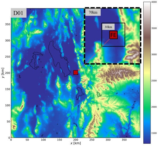 The FE simulations are initialized at 14:00 UTC (7:00 LST) 3 June 2022 and forced on the FE’s boundaries over the subsequent 5 h by the WRF simulation. The FE domain is an 81 km2 square region discretized using (Nz, Ny, Nx) = (1794, 1782, 122) grid points with a grid spacing of Δx,y = 5 m horizontally. Thus, the FE domain is comprised of ~400 million grid points and is ~0.05% of the WRF domain. (For reference, the current operational HRRR model uses 1799 × 1059 grid points and 52 vertical levels for a total of ~100 million grid points to cover the entire CONUS.) The vertical grid spacing in the terrain-following grid gradually expands as altitude increases to ~3600 m AGL to allow for boundary layer growth. Details regarding FE are available in the studies by Muñoz-Esparza et al. [22,23,24], and the Open Source version of FE is described online [42]. FE was run on NCAR’s high-performance computing system, Derecho, at the Wyoming Super Computing Center in Cheyenne, WY [43]. Each 5 h FE simulation (14:00–19:00 UTC 3 June) required 18 h across 64 GPUs (16 GPU nodes) on Derecho. Dozens of these simulations were made for testing and development, of which only one is described here. The FE simulation uses prescribed lateral, bottom, and top boundary conditions from the WRF simulation. The cell perturbation method described by Muñoz-Esparza et al. [44,45] introduces finite amplitude perturbations to the potential temperature perturbations near and along the inflow boundaries that are dynamically updated based on the WRF’s lateral boundary conditions. This method accelerates the generation and development of turbulence. To achieve full development and equilibrium of turbulence in regions of interest, a 1 km fetch from the boundary is imposed, which is less than that required for other methods [46,47].