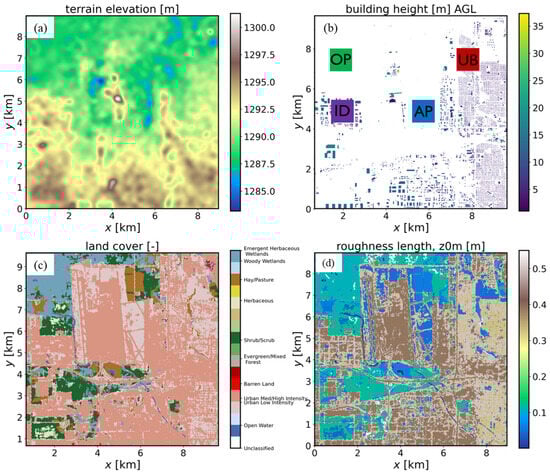 Figure 2 illustrates the terrain, land cover, building locations, and roughness length within the FE domain. A building mask was developed for the FE domain using ArcGIS Pro software to extract building height, size, elevation, and location from the USGS LPC UT Wasatch L4 2013 LAS 2016 Lidar dataset [48]. The Lidar dataset was subset into categories such as ground elevation, vegetation, and buildings. The ground elevation subset was used to create a digital terrain model (DTM), which is simply the elevation of the bare surface after minor smoothing to limit model instabilities. When comparing Figure 2a to Figure 1, very slight elevation gradients are evident across the FE domain. The DTM terrain was subtracted from a digital surface model (DSM) comprising the ground elevation and building subsets to extract building height (Figure 2b). The exact location and shape of the buildings were verified relative to 2018 building footprints from the Utah Geospatial Resource Center [49]. Structures with high root mean squared error (>2 m) were manually adjusted to match the building footprint. Between 2016 and 2022, most of the buildings remained unchanged, except that manual adjustments were necessary to reflect major upgrades to the airport during this period. As shown in Figure 2c, the 2016 USGS National Land Cover Database land cover and use were also processed for the FE domain. Following the same land cover to roughness conversion table used in WRF, land cover was used to assign to each grid point prescribed roughness length values, as shown in Figure 2d. These input grids were transformed to the WRF’s Lambert Conformal projection at 1 m resolution centered on the SLC Airport within the FE domain. The colored 1 × 1 km squares in Figure 2b define four representative subdomains shown in Figure 3: Open (OP), primarily shrub and grasslands with low roughness; Industrial (IP), large structures typically housing commercial distribution facilities near the airport; Airport (AP), open runway area within the airport facility with low roughness; and Urban (UB), small residential and commercial buildings.