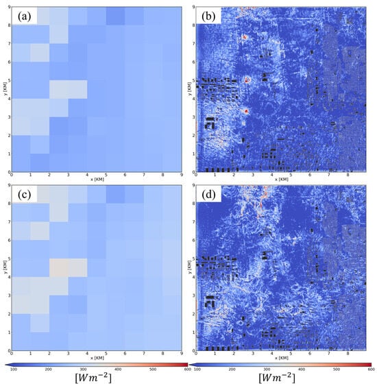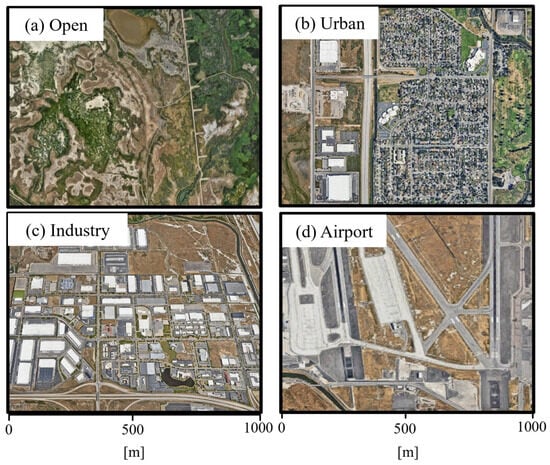 FE 1 × 1 km subdomains: (a) Open; (b) Urban; (c) Industry; and (d) Airport.