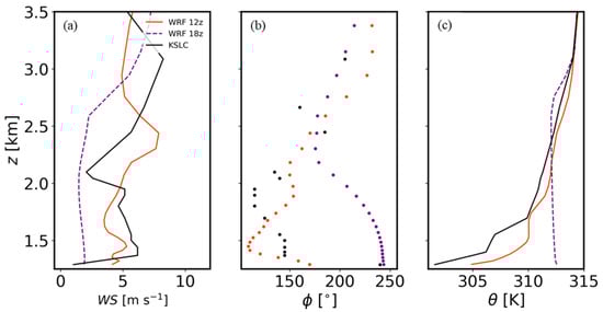 Observed vertical profiles (MSL) at KSLC (black) at 12:00 UTC (05:00 LST) 3 June 2022 of: (a) wind speed; (b) wind direction; and (c) potential temperature (θ). WRF-simulated profiles shown in each panel for 12:00 UTC (red) and 18:00 UTC (purple).