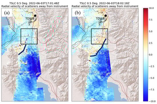 Plan view 0.5◦ radial wind speed (m s−1) from TSLC radar (black dot) for (a) 17:01 UTC 3 June 2022 and (b) 18:02 UTC 3 June 2022. Blue (orange) shading denotes flow toward (away) from the radar. The black box indicates the FE domain. The blue line denotes the position of the lake breeze front.