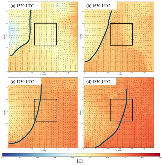 WRF 10 m wind barbs and 2 m θ within the 30 km domain shown in Figure 1 at: (a) 15:30 UTC; (b) 16:30 UTC; (c) 17:30 UTC); and (d) 18:30 UTC. Wind speeds of 1 m s−1 (5 m s−1) are denoted by half (full) barbs. The black box outlines the FE domain. The heavy blue line indicates the location of the lake breeze front.