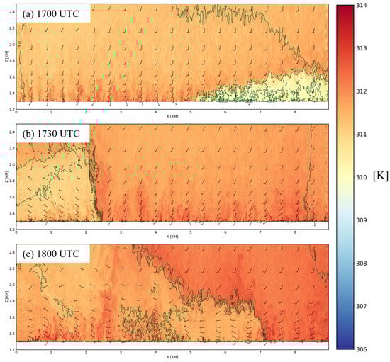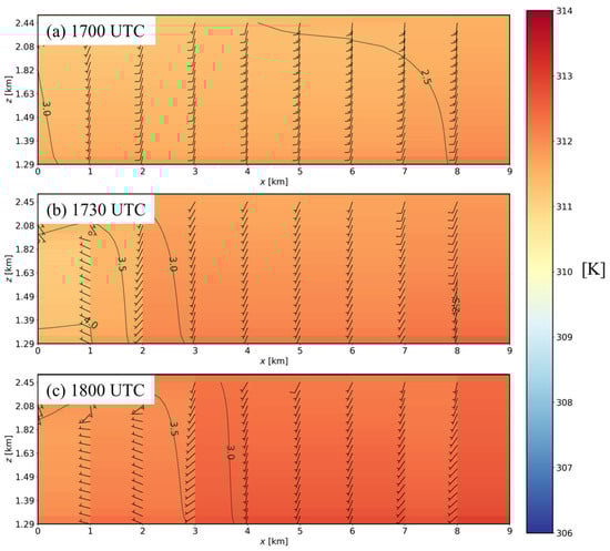WRF θ along the Y = 2 km east–west cross-section denoted in Figure 7a (shading in K), mixing ratio (green contours in g kg−1), and 10 m horizontal wind vectors at: (a) 17:00 UTC; (b) 17:30 UTC; and (c) 18:00 UTC. Wind speeds of 1 m s−1 (5 m s−1) are denoted by half (full) barbs.