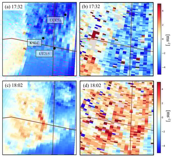 Radial wind speed at 0.5° elevation angle within the FE 9 km × 9 km domain according to the colorbar: (a) FE-simulated speeds at 17:32 UTC; (b) as in (a) except for TSLC-observed speeds; (c) as in (a) except at 18:02 UTC; (d) as in (c) except for TSLC-observed speeds. The red lines denote the east–west and north–south interstates (I-80 and I-215, respectively). Labels denote locations of stations in Figure 11.