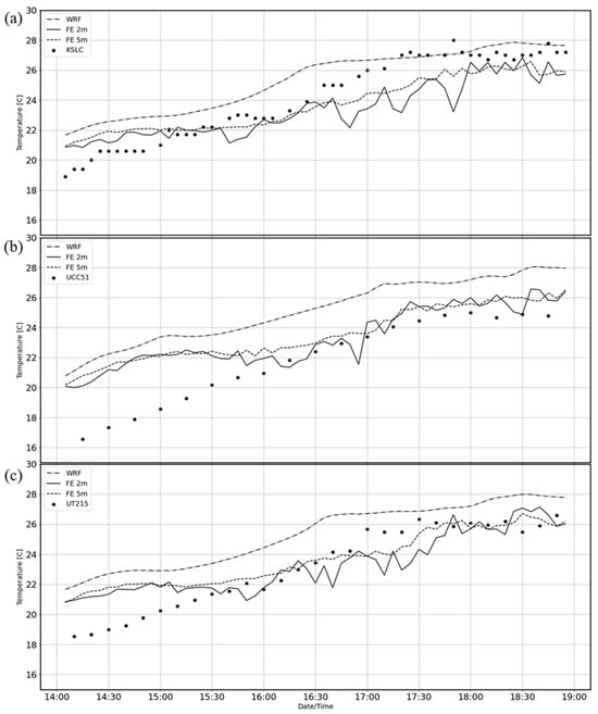 Observed 2 m air temperature (°C, dots) between 14:00 and 19:00 UTC at: (a) KSLC; (b) UCC51; and (c) UT215. Also shown are time series of WRF air temperature and FE 2 m and 5 m air temperature at these locations by dash-dot, long dash and short dash lines, respectively.
