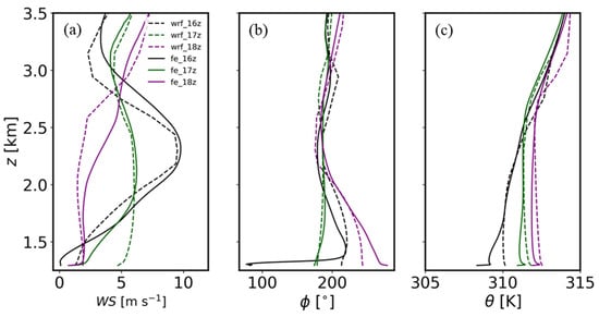 As in Figure 4, except from the WRF (dashed) and FE (solid) simulations at 16:00 UTC (black), 17:00 UTC (green), and 18:00 UTC (purple), for (a) wind speed, (b) wind direction, and (c) potential temperature.
