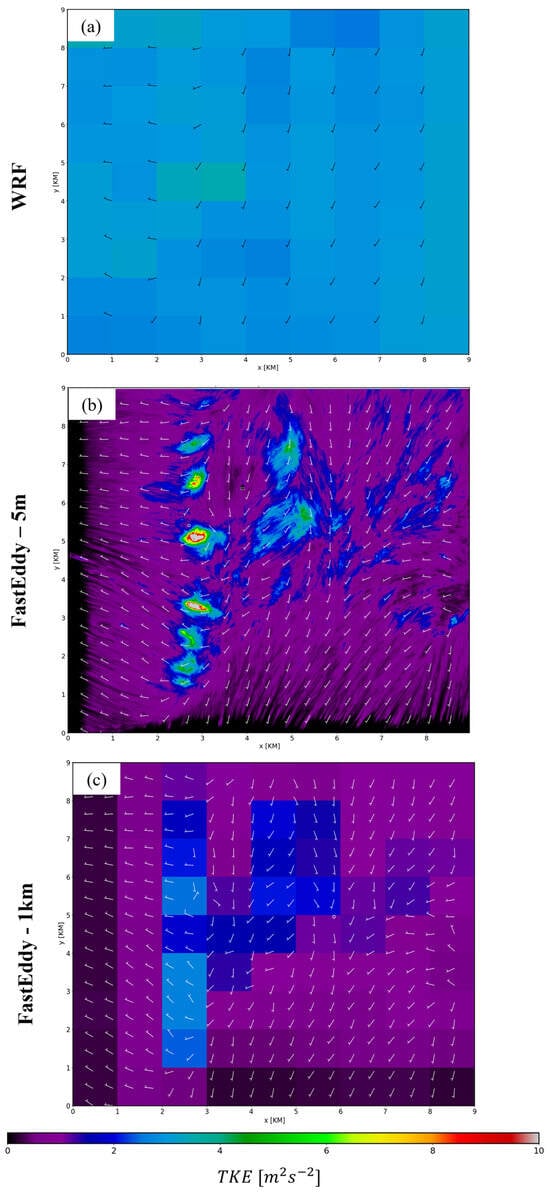 Comparing Figure 6 and Figure 7, there is a general tendency for 10 m AGL FE horizontal wind speeds to be lower than those simulated by WRF. The weaker wind field and the possible influence of the 2–5 m inversion layer may help to explain the lower production of TKE in the FE simulation compared to WRF (Figure 13). WRF TKE values of ~3–3.5 m2s⁻2 at 30 m AGL shown in Figure 13a represent the sub-1 km parameterized estimate of TKE over the 15 min period centered at 17:30 UTC. Figure 13b shows the sum of FE resolvable scale TKE (5 m–1 km scales) and FE sub-5 m parameterized TKE. FE has lower TKE than WRF over much of the domain, with large FE TKE limited primarily to the north–south-aligned frontal zone at this time. The very low TKE along the FE’s inflow boundaries reflects the spatial scales required to spin up the turbulence [44,45,46,47]. Upscaling the FE TKE to the same 1 km resolution of WRF (Figure 13c) reinforces the differences between TKE in FE and WRF. It should be noted that WRF exhibited higher surface temperatures relative to station observations (Figure 11), which could lead to increased buoyant thermal production and, consequently, higher TKE. Irrespective of the likely overall underestimate of TKE in this FE simulation, the very large TKE values along the front in excess of 10 m2 s⁻2 indicate the types of situations that would hamper UAS operations.