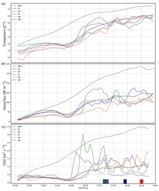 Time series from 14:00 to 19:00 UTC: (a) 2 m air temperature (°C); (b) heat flux (W m−2); and (c) 30 m TKE (m2 s−2). Values are shown for domain-averaged WRF (dashed black line), domain-averaged FE (black line), and within the subdomains (OP, green; ID, purple; UB, red/orange; AP blue). The frontal passage in each subdomain (OP, ID, UB, AP) is indicated by the respective colored boxes along the x-axis.